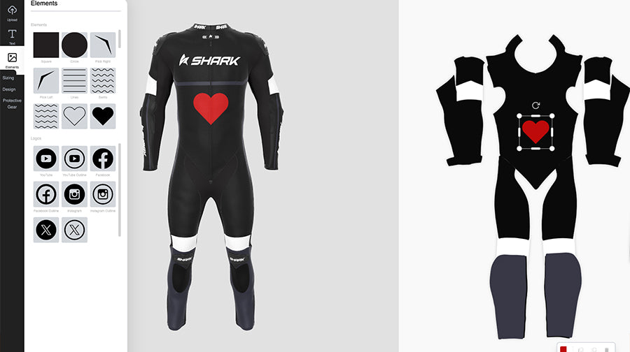 Your suit, your rules! Bring your vision to life by adding custom images and shape elements to every inch of your racing suit. Whether it’s a logo, graphic, or unique pattern, upload your personal designs and shape the suit exactly how you want it. Mix and match with endless possibilities to create a look that’s as dynamic and unique as your riding style.