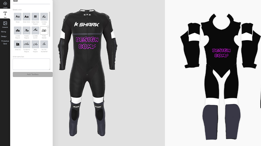 Make a statement with every ride! Our customiser lets you add any text you want to your racing suit using a wide selection of fonts and styles. Whether it’s your name, a racing number, or a personal motto, you can style it however you like—bold, sleek, or anything in between.